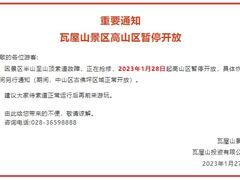 人民日报客户端1月27日晚,四川眉山瓦屋山景区官微发布通知称,因景区半山至山顶索道故障,正在抢修,2023年1月28日起高山区暂停开放,具体恢复时间另行通知(期间,中山区古佛坪区域正常开放)。