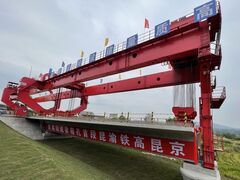 封面新闻川观新闻记者 王眉灵10月9日10时,经过数小时运输和架梁准备,随着架梁机的缓缓下降,一孔长32米、重达820吨的箱梁稳稳落在四川省泸州市江阳区境内的白云洞二号特大桥。至此,渝昆高铁建设迎来一关键节点——全线首孔箱梁成功架设,从下部结构施工转入上部结构施工,为实现工期目标、按期开通奠定坚实基础。首孔箱梁来自距白云洞二号特大桥近一公里的江阳制梁场,这里将预制599孔箱梁。川观新闻记者在现场看到,这是