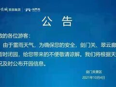 川观新闻广元观察 高志农 川观新闻记者 燕巧10月4日上午,川观新闻记者从剑门关华侨城获悉:因雷雨及大风天气,为确保安全,剑门关景区、翠云廊今日上午暂时闭园。开园时间将根据天气情况而定。据剑阁气象天气通报,10月3日20时至4日08时:剑门雨量65.2mm、下寺雨量62.4mm。目前剑阁县北部乡镇仍有对流云团产生并发展,预计今天白天到晚上全县普遍还有大到暴雨,偏北风5-7级。