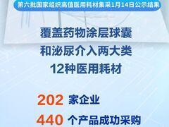 人民日报记者1月14日从国家医保局获悉,第六批国家组织高值医用耗材集采结果公示,纳入药物涂层球囊、泌尿介入两大类12种医用耗材,202家企业440个产品成功采购。医疗机构需求量大的主流企业中选,产品供应丰富多元。 截至目前,国家医保部门已成功采购9大类142种医用耗材,涉及心内科、骨科、外周血管科、眼科、耳鼻喉科、泌尿外科等临床领域。 患者预计2026年5月前后可使用上此次集采中选产品。