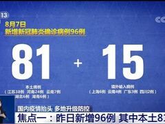 新华社央视网消息:近期国内疫情有抬头的态势,多地机场、口岸、定点医院陆续出现境外输入关联病例,并造成一定范围扩散。各地疫情有什么变化和特点?我们一起梳理今日焦点。焦点一:先来从数据看变化。国家卫健委今天(8月8日)发布,昨天(7日)各地报告新增新冠肺炎确诊病例96例,其中,本土病例81例,分别为江苏38例,河南24例,云南7例,湖北6例,湖南6例。另外15例为境外输入病例,分别为上海6例,云南4例,广东