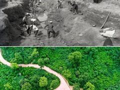 新华社拼版照片:上图为治理前,山西省右玉县随处可见的荒凉沙地(资料照片);下图为生机盎然的山西省右玉县小南山森林公园(2020年7月21日新华社记者曹阳摄,无人机照片)。新华社发绿,曾是山西右玉最稀缺的颜色,如今却是这里最厚重的“底色”。新中国成立初期,右玉林木绿化率不到0.3%,一年到头,黄风肆虐,粮食产量极低,严重威胁当地群众生存。70多年来,21任右玉县委书记以“功成不必在我”的境界,带领干部群众