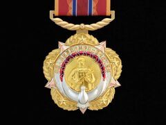 这是“中国人民志愿军抗美援朝出国作战70周年”纪念章(10月3日摄)。新华社记者 李贺 摄今年是中国人民志愿军抗美援朝出国作战70周年,中共中央、国务院、中央军委向参加抗美援朝出国作战的、健在的志愿军老战士老同志等颁发“中国人民志愿军抗美援朝出国作战70周年”纪念章。纪念章使用紫铜胎镀金、银材质,通径为50毫米。纪念章核心部分为志愿军战士形象和70束光芒,以和平鸽、水纹和中朝两国国旗元素编制的绶带