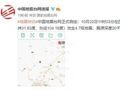 工人日报中国地震台网正式测定:10月22日11时03分在四川绵阳市北川县(北纬31.83度,东经104.18度)发生4.7级地震,震源深度20千米。多地网友表示震感强烈