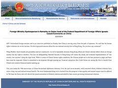 央视新闻当地时间8月4日,中国驻瑞士联邦大使馆在其官网援引中国外交部发言人的表态,对瑞士联邦委员兼外长卡西斯日前在接受《周日一瞥报》采访中称,中国正在偏离开放道路,侵犯人权的情况在增加,并对香港国安法表达了“关切”进行回应。中国驻瑞士联邦大使馆表示,中国外交部发言人指出,这样的言论缺乏依据,也不具建设性。中方多次强调,香港事务是中国内政,任何外国都无权干涉。香港国安法将使“一国两制”在法治的轨道上行稳致远
