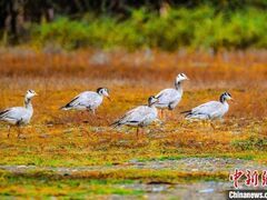 人民日报客户端中新网成都11月16日电 (记者 刘忠俊)连日来,在四川省甘孜藏族自治州炉霍县境内的草原、湿地与湖泊,成群结队迁徙的候鸟时而振翅高飞,时而嬉戏于水面,与周围的山水美景相互映衬,绘制出一幅幅自然与生态和谐共生的绚丽图景。 炉霍湿地迁徙的候鸟斑头雁。刘忠俊 摄走进炉霍县鲜水河国家湿地公园,不少藏族群众、游客正驻足欣赏迁徙途中小憩的候鸟。远处,50余只“鸟中大熊猫”黑鹳正在湿地内觅食栖息,10余名手持“