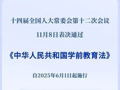 央视新闻客户端学前儿童是祖国的未来、民族的希望,保障学前儿童合法权益,对学前儿童健康成长、全面发展具有重要意义。 11月8日,十四届全国人大常委会第十二次会议表决通过《中华人民共和国学前教育法》,自2025年6月1日起施行。 学前教育法明确,国家建立健全学前教育保障机制,推进普及学前教育,构建覆盖城乡、布局合理、公益普惠、安全优质的学前教育公共服务体系。 本法规定,学前教育应当坚持最有利于学前儿童的原则,给予学