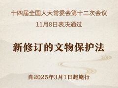 新华社十四届全国人大常委会第十二次会议11月8日表决通过新修订的文物保护法,自2025年3月1日起施行。 此次修订文物保护法,将我国文物工作取得的历史性成就和宝贵经验上升为法律,进一步完善文物法律制度框架,推动文物工作法治化、规范化、制度化,为推进实现文物领域治理体系和治理能力现代化提供更好法治保障。 文物保护法自1982年11月颁布实施以来,历经1次修订和5次修正,此次再次进行修订,标志着我国文物保护