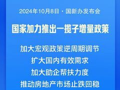 财联社国家发展改革委主任郑栅洁10月8日在国新办发布会上介绍,针对当前经济运行中的新情况新问题,党中央、国务院科学决策、果断出手,在有效落实存量政策的同时,围绕加大宏观政策逆周期调节、扩大国内有效需求、加大助企帮扶力度、推动房地产市场止跌回稳、提振资本市场等五个方面,加力推出一揽子增量政策,推动经济持续回升向好。