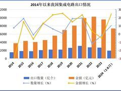 中国新闻网人民网北京9月25日电 (记者王震)近日,海关公布数据显示,今年前8个月,我国集成电路出口7360.4亿元,增长24.8%;集成电路出口已经超过汽车(同期汽车出口金额为5408.4亿元),成为中国出口产品的重大品类。 数据显示,我国集成电路出口正走出下行压力,逐渐恢复“活力”。 拉长时间维度,十年来,集成电路出口额增长超过1.5倍。2023年,我国集成电路出口数量和出口金额分别达到2678亿个和9