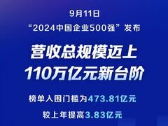 9月11日,中国企业联合会、中国企业家协会发布“2024中国企业500强” 今年榜单入围门槛为473.81亿元,较上年提高3.83亿元 “500强”营收规模迈上新台阶,共实现营业收入110.07万亿元,较上年增长1.58% 平均研发强度连续第7年提高,榜单企业研发投入总额占营业收入总额的1.90%,为2002年以来的最高值 记者:刘羽佳