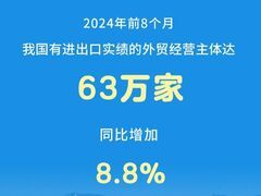 中国新闻网9月10日 海关总署发布2024年前8个月外贸数据 据海关统计 我国外贸经营主体持续活跃 前8个月 有进出口实绩的外贸经营主体达63万家 同比增加8.8% 其中,外贸主力军民营企业进出口15.74万亿元 此外,数据还显示 前8个月,我国货物贸易保持增长 进出口总值28.58万亿元,同比增长6% 其中 出口16.45万亿元,同比增长6.9% 进口12.13万亿元,同比增长4.7% 记者:邹多为、魏弘