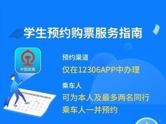 川观新闻为更好满足学生旅客出行需求,铁路部门对12306手机客户端学生购票相关服务功能进行优化,推出“学生预约购票服务”功能、“学生出行需求采集”功能。 “学生预约购票服务”功能 自8月20日至9月8日每日5:00—23:00,铁路部门针对12306注册用户类型为学生的(需要提前填写学生优惠资质核验信息),在“我的”页面轮播区域增加“学生预约购票服务”入口,可预约车票乘车日期为9月5日至9月23日。进入预