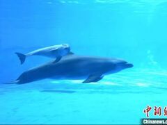 中新网海南陵水8月10日电 (张月和)7月6日,宽吻海豚“娜雅”在海南陵水成功产下一只雌性小海豚“灵宝儿”。8月9日,笔者在海南海洋欢乐世界度假区海豚馆中看到,已满月的“灵宝儿”跟随“娜雅”在水中游弋,动作流畅、灵巧敏捷。面对来访者,“灵宝儿”好奇地频频打量,显示出活泼胆子大的性格特点。 8月9日,在海南海洋欢乐世界度假区的海豚馆中,刚满月的宽吻海豚“灵宝儿”跟随母亲在水中游弋,并好奇地打量来访者