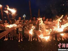 中国新闻网中新网凉山7月30日电 题:四川凉山彝族火把节:共享火把“不夜天” 作者 袁牟知博 汤雁 跳跃的火苗映出男女老少微笑的面庞,人们手牵着手,围着熊熊燃烧的巨大篝火,随着音乐的律动跳起达体舞,狂欢的夜晚似乎没有尽头……29日晚,在四川省凉山州西昌市,燃烧的火把映红了天空。 图为29日晚“激情火把节·最炫民族风”西昌火把狂欢夜活动现场。 记者 王磊 摄凉山州是中国最大的彝族聚居区。彝族崇尚火,认为生命的