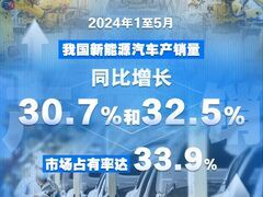 央视新闻客户端记者6月14日从中国汽车工业协会获悉 2024年1至5月,我国汽车产销量 分别达1138.4万辆和1149.6万辆 同比分别增长6.5%和8.3% 其中,新能源汽车产销量 分别达392.6万辆和389.5万辆 同比分别增长30.7%和32.5% 市场占有率达33.9% 新能源汽车产业延续良好发展态势