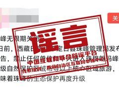 川观新闻2024年6月13日 谣 言 珠穆朗玛峰无限期关闭? 真相:近日,有网民在社交平台发文称:“珠峰无限期关闭。日前,西藏日喀则市定日县珠峰管理局发布公告,禁止任何单位和个人进入珠穆朗玛峰国家级自然保护区绒布寺以上核心区域旅游,这意味着珠峰的生态保护再度升级”。对此,珠穆朗玛峰国家级自然保护区定日县管理分局发布公告表示:网传“珠峰无限期关闭”的信息不实。根据《中华人民共和国自然保护区条例》《珠穆朗