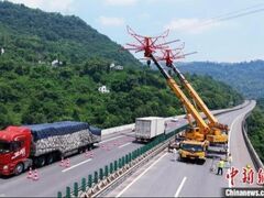 中新社微信公众号中新网重庆6月4日电 (记者 周毅)4日,记者从国网重庆市电力公司获悉,国网重庆市电力公司首次应用“移动式伞形跨越架”技术,对重庆市万州区境内的110千伏高天线输电线路进行升级改造,工程通过验收后,正式投入运行。这也是该技术在成渝地区电网建设中首次使用。 图为国网重庆市电力公司首次使用移动式伞形跨越架防护装备,对输电线路进行升级改造。王倩摄 据悉,为提高输电线路供电可靠性,提升重庆市迎峰度夏期间电