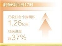 科技日报数据来源:农业农村部 制图:张丹峰中原粮仓,风吹麦浪遍地金。河南省邓州市文渠镇李洼村的麦田里,传来收割机隆隆的轰鸣声。“农机给力,1500多亩麦子两天工夫都收完了!”荣冠农作物种植合作社理事长刘韶威介绍,合作社种的是弱筋小麦,亩产在1100斤左右,跟厂家签订了专用品种收购协议,销路不愁。 记者从农业农村部获悉:截至6月1日17时,全国已收获冬小麦面积1.26亿亩,收获进度37.27%,进入收获高峰