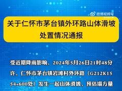 央视网央视网消息:据@今日仁怀 微博消息,仁怀市应急管理局5月27日通报,受近期降雨影响,2024年5月26日21时48分许,仁怀市茅台镇岩滩村外环路(G212 K1554+600处)发生一起山体滑坡,预估塌方量1600立方米。山体滑坡造成1人受轻微伤、3台车辆受损,受伤人员已及时送医院治疗,无人员死亡及车辆被掩埋。 目前,道路排险除险工作正有序进行,G212 K1552+K1557+010(茅台镇外环