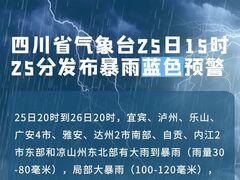 中国新闻网四川省气象台25日15时25分发布暴雨蓝色预警:25日20时到26日20时,宜宾、泸州、乐山、广安4市、雅安、达州2市南部、自贡、内江2市东部和凉山州东北部有大雨到暴雨(雨量30-80毫米),局部大暴雨(100-120毫米),最大小时雨量40-70毫米。过程中伴有局地雷暴大风、冰雹等强对流天气。