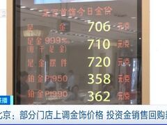 证券日报国际金价维持高位让黄金消费持续受到关注。记者走访了解到,目前国内部分黄金品牌门店调高了零售价格。此外,投资金条的销售和回购也持续受到关注。 在北京的一家金店,受国际金价上涨影响,店内足金饰品的价格已调至每克706元,足金999的价格则上调至710元。而随着金价一路上涨,也有部分消费者并未着急出手,仍在观望。 这轮价格跳涨后,投资金条的购买量和回购量也出现一定增长。记者看到,投资金条的柜台前排起了长