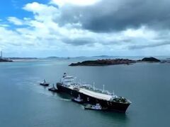 央视新闻客户端央视网消息:5月15日,我国最大规模液化天然气运输船建造项目中海油液化天然气运输船项目首制船“绿能瀛”号在上海市长兴岛成功交付。 “绿能瀛”号总长299米、型宽46.4米,所用钢材达2.5万吨,其甲板面积相当于3个标准足球场,可装载17.4万立方米液化天然气,能够满足700万个家庭1个月的用气,可高效适配多元航线运营要求。 海上运输是连接液化天然气资源和国内用户的重要一环。以“绿能瀛”为代表的国产