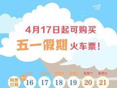 央视新闻客户端五一小长假临近 有出行计划的旅客 4月17日起可以 购!买!车!票!啦! 4月16日可买4月30日车票; 4月17日可买5月1日车票; 4月18日可买5月2日车票; 4月19日可买5月3日车票; 4月20日可买5月4日车票; 4月21日可买5月5日车票。 铁路部门提示,铁路12306网站(含手机客户端)是官方唯一火车票网络售票渠道,请广大旅客朋友一定要通过官方渠道购票。