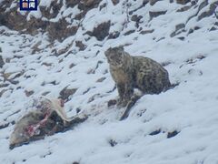 4月9日,四川石渠县洛须省级自然保护区的护林员,在海拔4500多米的雪山上,近距离拍摄到国家一级保护动物雪豹进食的画面。 画面中,一只雪豹蹲在雪地上,不时转头梳理毛发,甚至还回头与护林员对视。随后,这只雪豹站起来,伸展懒腰,走到被它捕获的一只猎物前,大快朵颐吃了起来。 雪豹被誉为“雪山之王”,是国家一级保护动物,其生存环境的优劣直接关系到物种的存续。近年来,随着保护力度增大,四川多次在保护区里拍摄