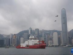 新华社香港4月8日电(记者郭辛、周圆)在历经5个多月南极科学考察后,中国第一艘自主建造的极地科学考察破冰船“雪龙2”号8日首次到访香港,展开为期5天的活动。 4月8日,“雪龙2”号缓缓驶入香港尖沙咀海运码头,展开为期5天的首次访港行程。新华社记者 吕小炜 摄当日10时许,香港维多利亚港,两艘拖船和一艘消防船对射形成水拱门,同时,在香港特区政府飞行服务队2架直升机、香港九龙巴士公司8辆双层巴士和多艘