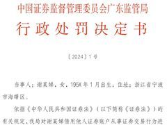 新华财经近日,广东证监局发布2024年的“1号罚单”,“50后”的谢某娣因借用他人账户从事证券交易被处罚。 罚单显示,谢某娣借用多达5个证券账户从事证券交易,证券交易总额高达35.77亿元。依据相关规定,广东证监局对谢某娣责令改正,给予警告,并处以40万元的罚款。 借用他人账户巨额交易35.77亿元 据广东证监局发布的行政处罚决定书显示,谢某娣,女,195X年1月出生,住址为浙江省宁波市海曙区。 2019
