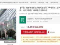 新华社客户端1月18日,京东拍卖官网显示,北京市第二中级人民法院将对成都环球中心部分房产进行司法拍卖,评估价16.90亿元,起拍价11.5亿元,相当于打了七折。 本次起拍时间为1月25日上午10点,保证金1.725亿元,加价幅度575万元,截至目前已有900余人围观此次拍卖,尚无人报名。 拍卖信息显示,上述拍卖标的为成都市高新区天府大道北段1700号10栋1层1号、11栋1层1号、12栋1层1号、13栋1层1