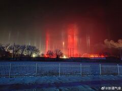 央视新闻客户端2023年12月17日08时,新疆阿勒泰地区哈巴河县出现“寒夜灯柱”现象。夜色中一束束光柱根根竖立直冲天空,迷幻极了。
