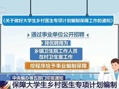 央视新闻客户端近日,中央编办、国家卫生健康委、教育部、财政部、人力资源和社会保障部联合印发通知,要求做好大学生乡村医生专项计划编制保障工作,引导和鼓励医学专业高校毕业生充实优化乡村医生队伍,促进高校毕业生就业。 《通知》明确各地按照大学生乡村医生专项计划招录的2023届高校毕业生,以及2020年以来通过“医学专业高校毕业生免试申请乡村医生执业注册政策”进入村卫生室工作的大学生,通过事业单位公开招聘,择优聘用为乡