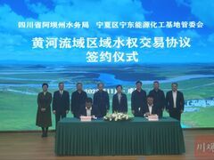 央视新闻客户端交易协议签约仪式。川观新闻记者 邵明亮 文/图 “节约的水能卖钱!”11月23日11时30分许,拿着签完字的《四川宁夏黄河流域区域水权跨省交易协议》,阿坝州水务局局长张险峰喜上眉梢。 就在刚才,宁夏回族自治区宁东能源化工基地管理委员会(简称“宁东基地”)以1800万元的价格,购得四川阿坝州出让的2024-2026年共计1500万立方米黄河用水权,并在中国水权交易所交易成功,成为全国首单跨省区域水