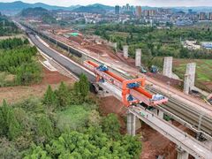 川观新闻汉巴南铁路南巴段施工现场。蜀道集团供图刘格格 川观新闻记者 王眉灵 11月16日,在汉巴南铁路南充至巴中段(以下简称“汉巴南铁路南巴段”)施工现场,架梁机将最后一榀重约370吨、长32米的预制箱梁,平稳放在冯家寺中桥1号墩与0号台之间。由此,汉巴南铁路南巴段主线112座桥梁架设全部完成,为下一步全线铺轨完成奠定坚实基础。 汉巴南铁路南巴段由蜀道铁路投资集团主导投资建设,是四川省首条由地方全额出资并