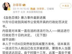 澎湃新闻11月14日,孙菲菲晒出自己遭遇的《血色恋情》剧组暴力事件最新进展:辽宁丹东凤城市公安局开具的行政处罚决定书显示,该局对姚某作出行政拘留十日并罚款五百元的决定。 网友在最新微博下面留言,有人安慰公道自在人心,有人感叹人生能有几个十三年,有人表示正义终究会到来。 据悉,今年8月29日深夜,许久未露面的演员孙菲菲发文称:“娱乐圈的霸凌事件,我是亲历者。”随后,她在长文中曝光自己2010年在电视剧《血色