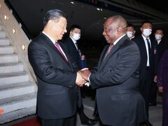 新华社约翰内斯堡8月22日电 这是“同志加兄弟”的握手! 当地时间8月21日晚,国家主席习近平抵达约翰内斯堡,出席金砖国家领导人第十五次会晤并对南非进行国事访问。这是习近平在机场受到南非总统拉马福萨等热情迎接。新华社记者 黄敬文 摄当地时间8月21日晚,国家主席习近平抵达约翰内斯堡,出席金砖国家领导人第十五次会晤并对南非进行国事访问。 晚11时许,习近平乘坐的专机抵达约翰内斯堡坦博国际机场。南非总