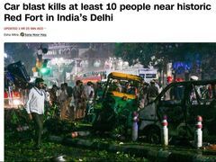央视网中新网11月11日电 综合外媒报道,当地时间10日,印度首都新德里红堡地铁站附近发生汽车爆炸事件,已造成至少10人死亡,另有多人受伤。 图片来源:美国有线电视新闻网(CNN)报道截图据报道,警察局长通报称,10日18时52分左右,一辆“慢速行驶”的汽车在地铁站附近红灯前停下,车内发生了爆炸,同时波及附近车辆,造成人员伤亡。相关部门已抵达现场,警方正在密切关注事态发展。 据《今日印度》报道,印度总理