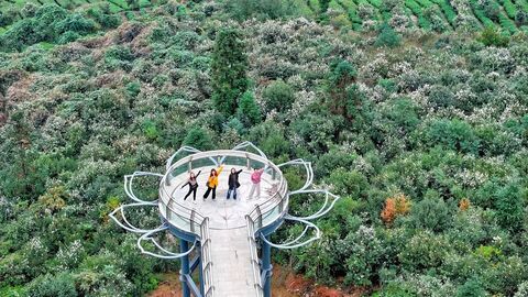 自贡网自贡融媒记者 罗乐 李秋玥 文/图 11月11日,晨曦中的荣县度佳镇茶花谷,油茶树身披洁白“外衣”,沿着山势起伏绵延。花海间,三五成群的游客举步漫游,在树丛中打卡留念,欢声笑语回荡在山谷间。当天上午,乐山人李芬华驱车蠕行在蜿蜒曲折的产业道上。同行好友不待下车,便迫不及待地开始了直播:“大家看,这片油茶花太美了,白色花瓣、黄色花蕊,在阳光下还会反光,简直是拍照圣地!”直播间里立刻涌上一波点赞和评论。