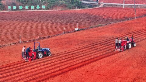 自贡网自贡融媒记者 罗乐 李秋玥 文/图 12月17日,在贡井区五宝镇照石村的田地里,大型农机成了绝对的“主角”。现场,农机来回穿梭,一场高效率、标准化的马铃薯播种作业正在进行。当天,两台马铃薯一体化播种机轰鸣着驶入规划整齐的田间。农机分工明确:前端农机手专注驾驶,沿设定路线行进;后端两位操作手则负责确认种薯芽点方向。机器驶过,一次性完成开沟、施肥、播种、覆土、起垄等多道工序。身后,一行行笔直、匀称的田