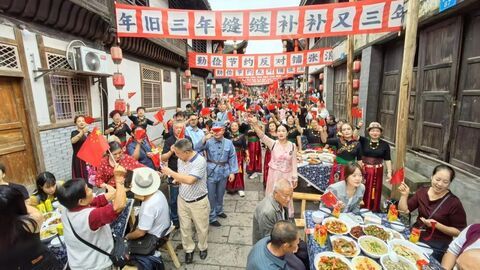 自贡网自贡融媒记者 周嘉 文/图 “来喽,来喽,上菜喽!”伴随着大厨的吆喝声,10月1日中午12点,在富顺县赵化镇古建筑保存最完整的新华街上,120桌宴席坐得满满当当,赵化古镇传统民俗活动——千人坝坝宴在此热闹开席。值得一提的是,今年活动主题为“盐宴长红”,游客不仅可以在坝坝宴上尝到“忆苦思甜”餐,还可通过多个场景和游戏,沉浸式体验抗战时期那段“烽火岁月”。坝坝宴是赵化镇传统饮食民俗之一,过去宴席每桌都