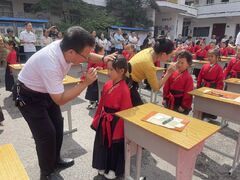 富顺县融媒体中心杨艳 自贡融媒记者 刘晓丹 文/图 9月29日,大安区何市镇中心学校举办以“开笔启智 礼润人生”为主题的一年级新生开笔礼活动,80余名新生在传统仪式中开启求学之路。活动伊始,孩子们整理衣领、甩动衣袖,以整洁仪容迈出“知礼明理”第一步。随后,全体新生向师长行三鞠躬礼,一谢“授书之恩”、二谢“明理之恩”、三谢“力学为善”,满含对师长的敬意。该校相关负责人与一年级教师手持朱砂笔,逐一为学生轻点眉心红痣,