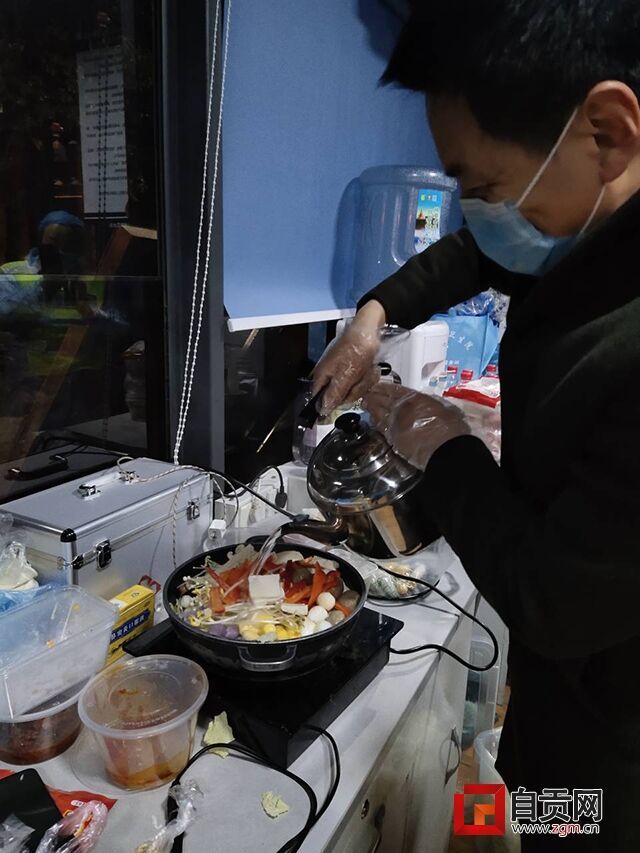 “同志,谢谢你们的守护!真是太辛苦了,趁着菜还是热乎的快吃了吧,这也是我的一点心意。”热心市民李先生冒着寒风细雨,为这个点上24小时轮班值守的医护人员、执勤交警等送来了简易火锅。