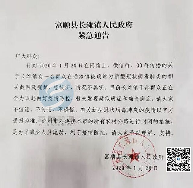 针对2020年1月28日在网络上、微信群、QQ群传播的关于长滩镇有一名群众在通滩镇被确诊为新型冠状病毒肺炎的相关截图及视频。经核实,情况不属实。目前长滩镇干部职工正在全力以赴做好疫情防控,暂未发现疑似病症和确诊病症,请大家不信谣、不传谣、不恐慌,有关新型冠状病毒肺炎的疫情以官方通报为准。泸州市对接连本市的所有农村公路进行封闭的措施,是为了减少人员流动,利于疫情防控,请大家不要产生联想。