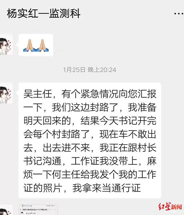 1月20日,杨实红从四川自贡启程回甘肃老家。他的家位于甘肃省陇南市的一个较偏远村镇,原计划2月1日返回单位。“因为疫情工作的需要,单位先通知初四上班,然后初一通知尽量早点回来。”杨实红说,考虑到这一情况,他决定,初二就启程回单位。