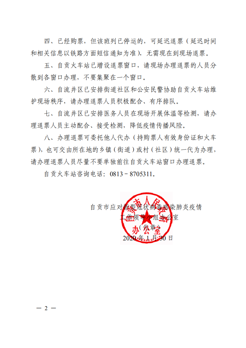 七、自流井区已安排医务人员在现场开展体温等检测,请办理退票人员主动配合、接受检测,降低疫情传播风险。