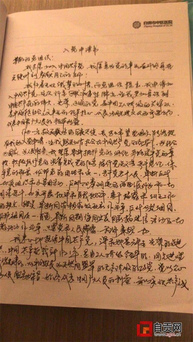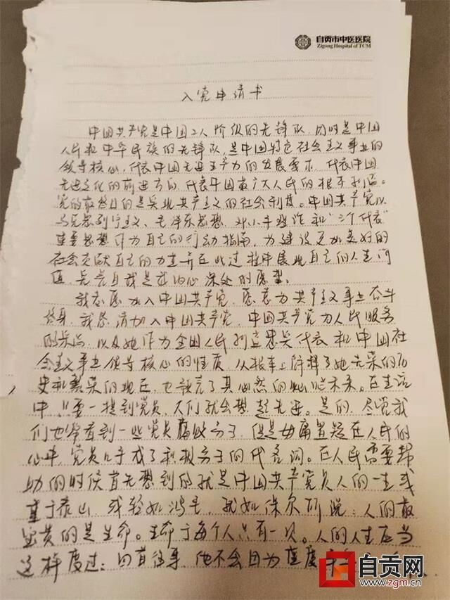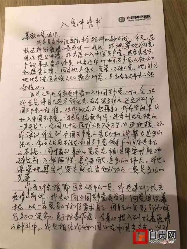 “在抗击新冠疫情的最前线,我诚挚地向党组织提出申请,志愿加入中国共产党,愿意为共产主义事业奋斗终生……”1月29日,自贡市中医院收到了钟兴波、陈秀梅、赖柯汶三名医务人员提交的入党申请书。