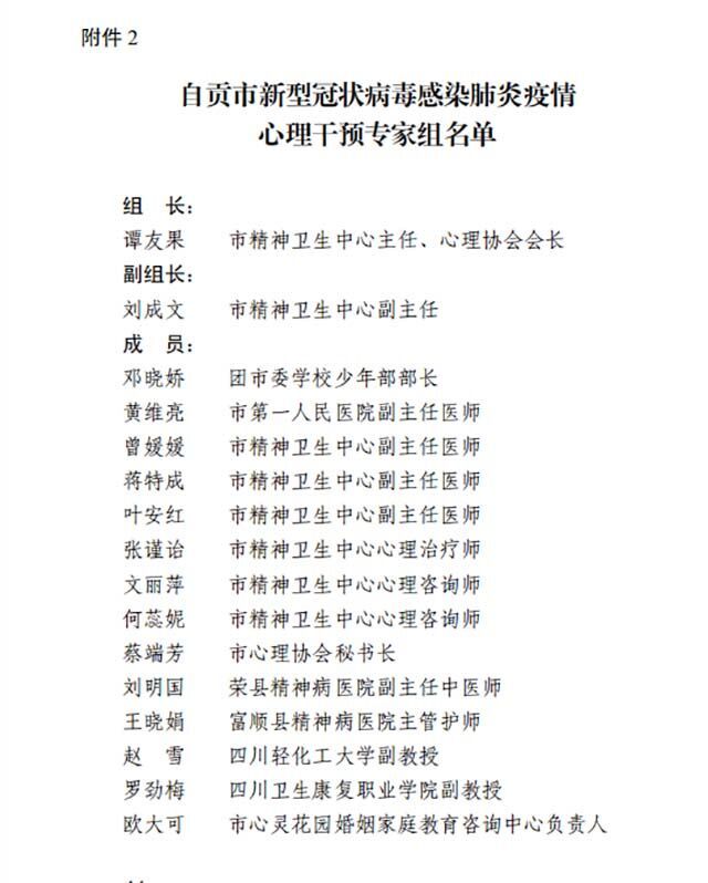 2、自贡市新型冠状病毒感染肺炎疫情心理干预专家组名单