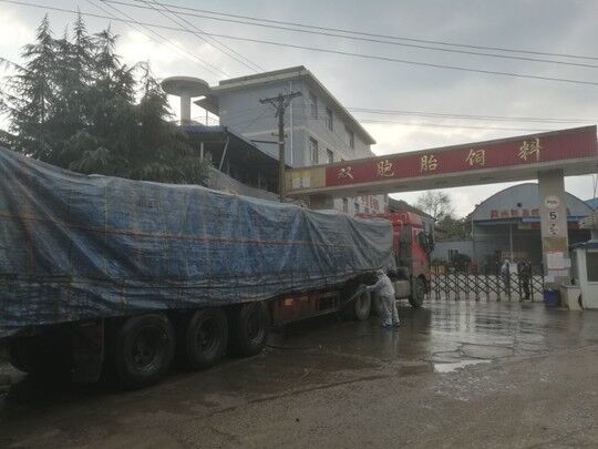 2月3日复工首日,位于自贡市大安区的成都双胞胎饲料有限公司自贡分公司生产车间里,处处闪现着工人们忙碌的身影。而在厂区大门外,两辆满载着100吨豆粕的大货车经过清洗后驶入厂区。